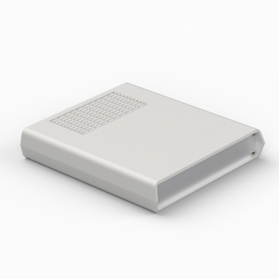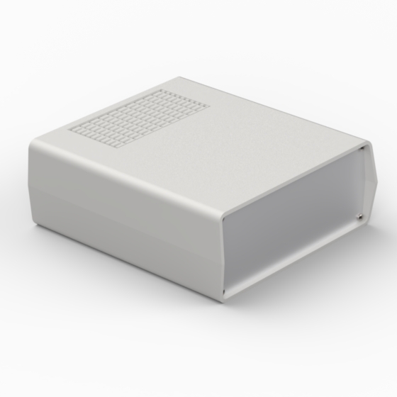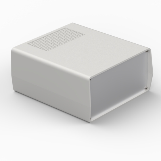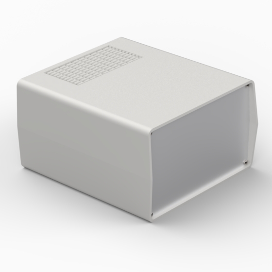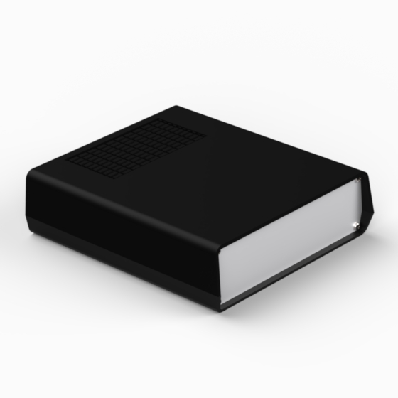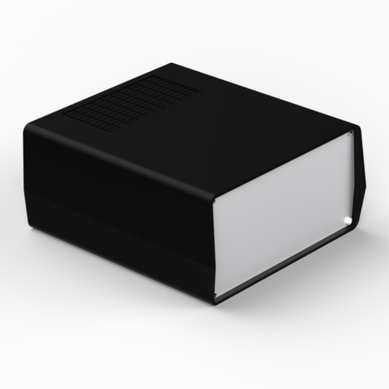 ABS enclosures with a vented cover and base for aeration. Front and rear 1 mm aluminium panels. Each half-shell has integral PCB guides and mounting studs. Matt surface finish. Closing by eight screws.