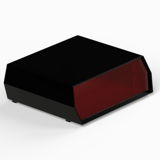 A polystyrene enclosure with a red polystyrene 20° inclined panel. Each half-shell has integral PCB mounting studs. The models “D/13” and “D/14” have in the rear side a cutout for cabling. Matt surface finish. Closing by four screws.