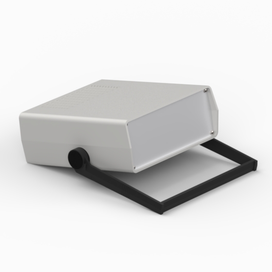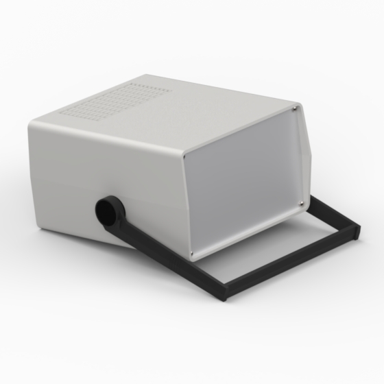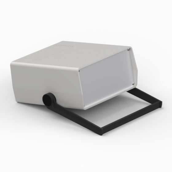 ABS enclosures with a handle that can be locked in any of eight positions and used as a stand. Vented cover and base for aeration. Front and rear 1 mm aluminium panels. Each half-shell has integral PCB guides and mounting studs. Matt surface finish. Closing by eight screws.