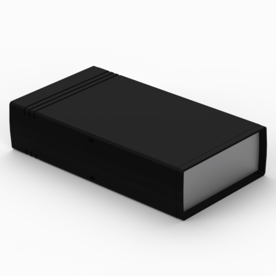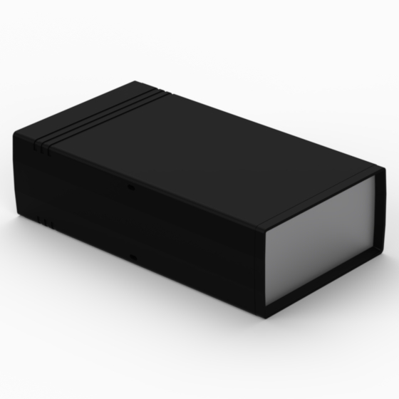 ABS enclosures with two 1 mm aluminium panels. Each base and cover have integral PCB guides (Eurocard 100 x 160 mm) inside. Matt surface finish. Snap-together closing, no screws required.