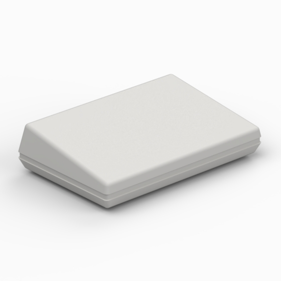ABS case with inclined cover. The base and the cover have integral PCB mounting studs. Matt surface finish. Closing by four screws.