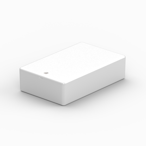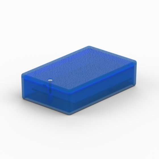 ABS enclosure with rounded corners. Base and cover have integral PCB mounting studs. They are moulded in white and transparent blue. Matt surface finish. Closing by one screw.