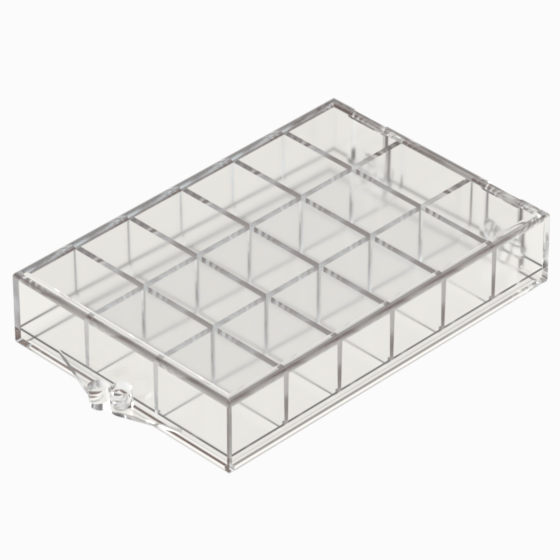 Series of small storage boxes with hinged transparent polystyrene lid. Glossy surfaces finish.