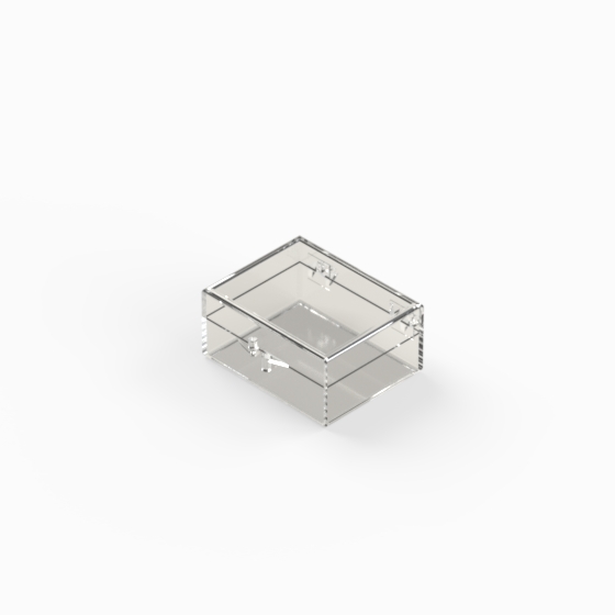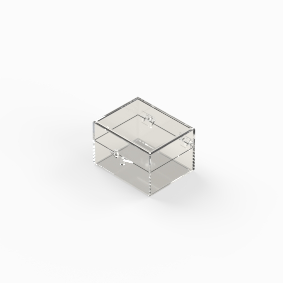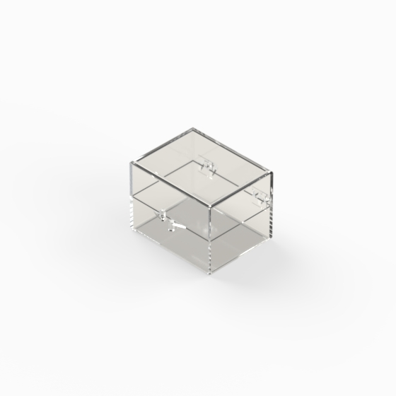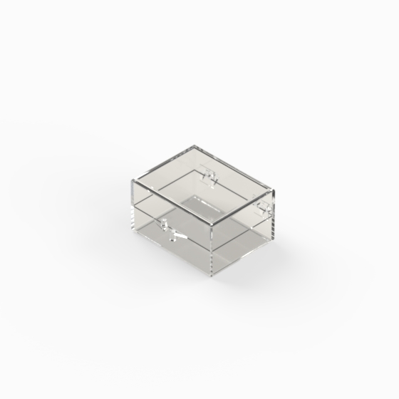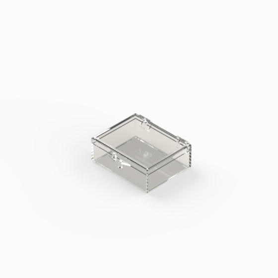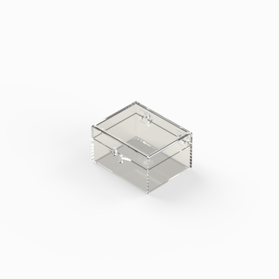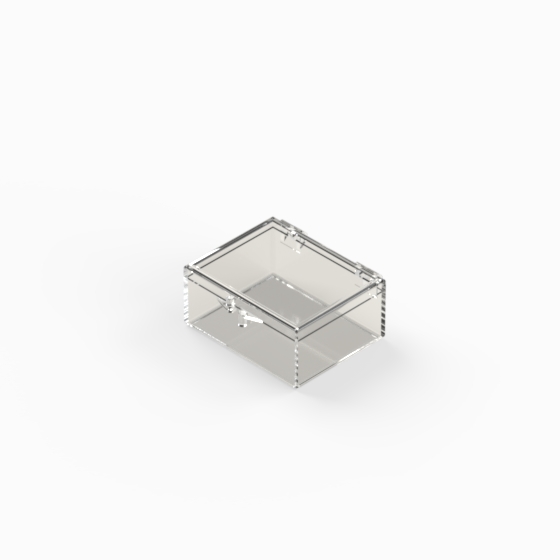 Series of small storage boxes with hinged transparent polystyrene lid and bottom. Glossy surfaces finish.