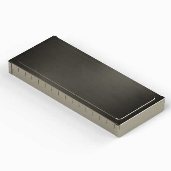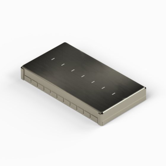 A hot tin-plated steel enclosure with Snap-On, finger-flanged cover and vertical dividers. The dividers have a hole and cutout for wiring. Volume of casing is suitable for easy assembly of professional and High-Technology circuits.