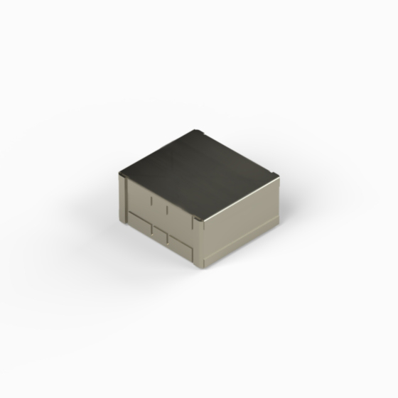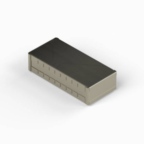 A hot tin-plated steel enclosure with two Snap-On, finger-flanged lids to allow access from top and bottom case.