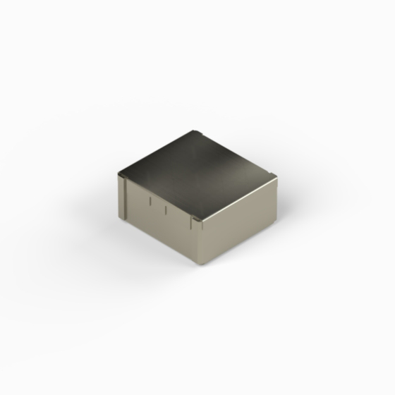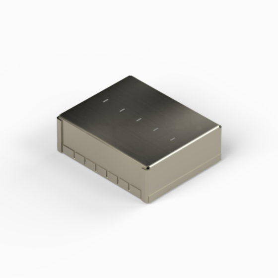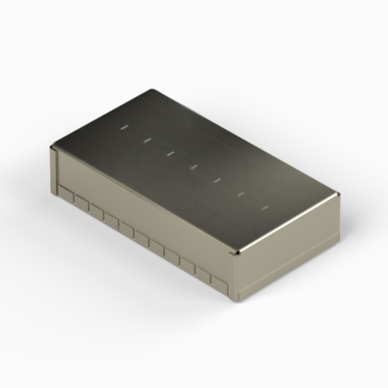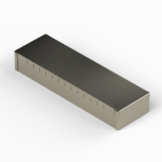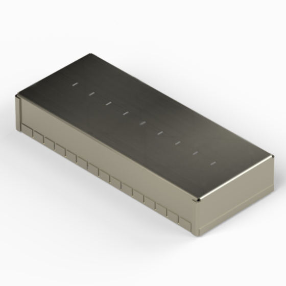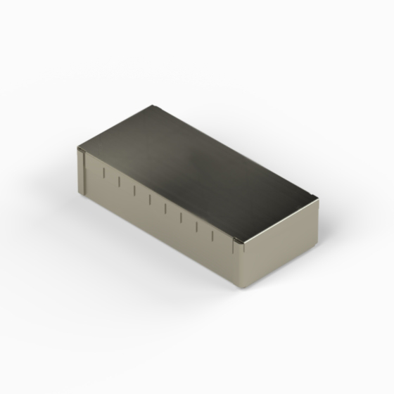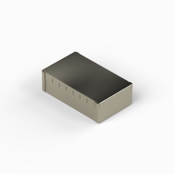 A hot tin-plated steel enclosure with Snap-On, finger-flanged cover and vertical dividers. The dividers have a hole and cutout for wiring. Volume of casing is suitable for easy assembly of professional and High-Technology circuits.
